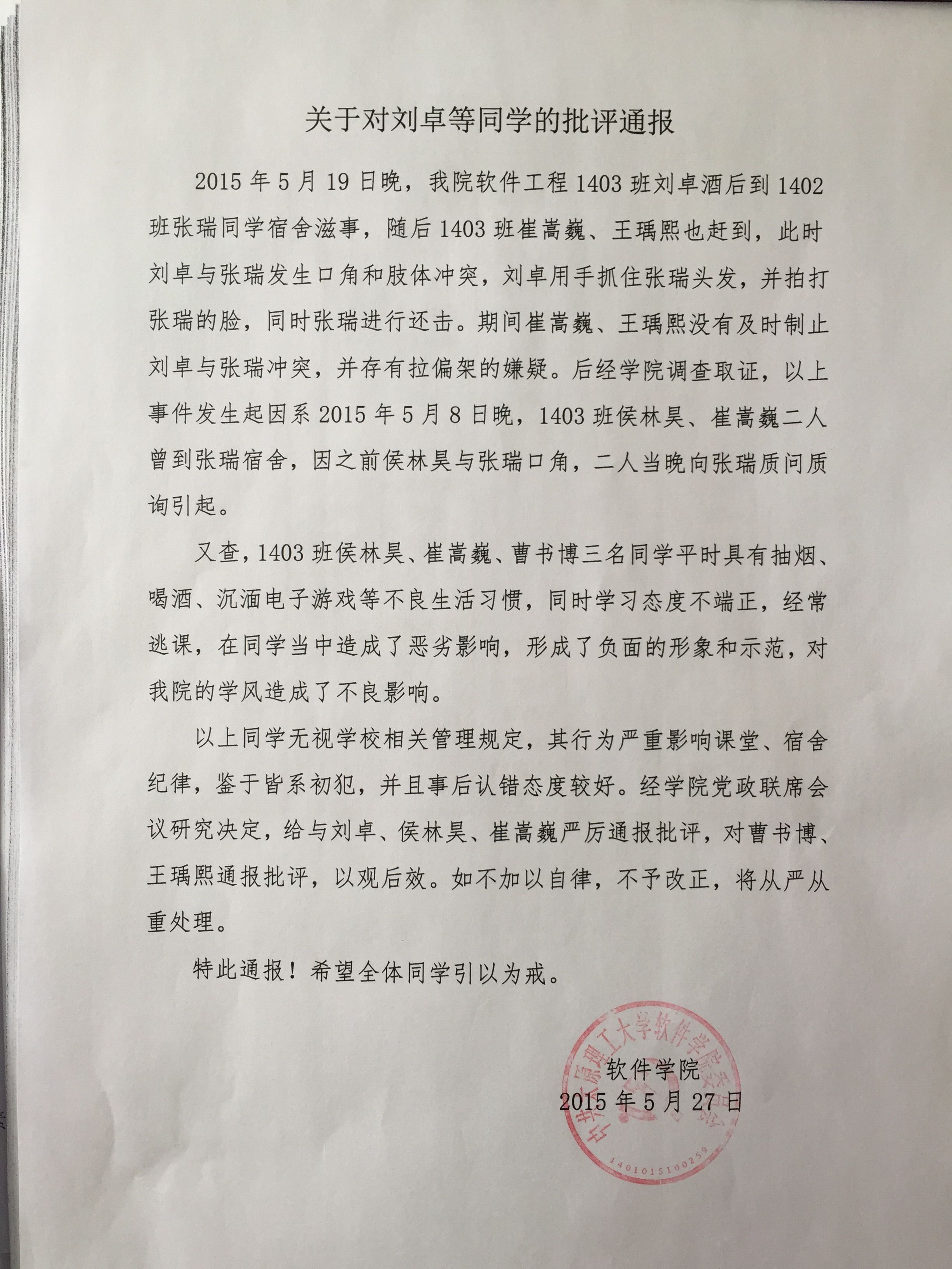 2015年5月19日晚,新浦金官网软件工程1403班刘卓酒后到1402班张瑞同学宿舍滋事,随后1403班崔嵩巍、王瑀熙也赶到,此时刘卓与张瑞发生口角和肢体冲突,刘卓用手抓住张瑞头发,并拍打张瑞的脸,同时张瑞进行还击。期间崔嵩巍、王瑀熙没有及时制止刘卓与张瑞冲突,并存有拉偏架的嫌疑。后经学院调查取证,以上事件发生起因系2015年5月8日晚,1403班侯林昊、崔嵩巍二人曾到张瑞宿舍,因之前侯林昊与张瑞口角,二人当晚向张瑞质问质询引起。