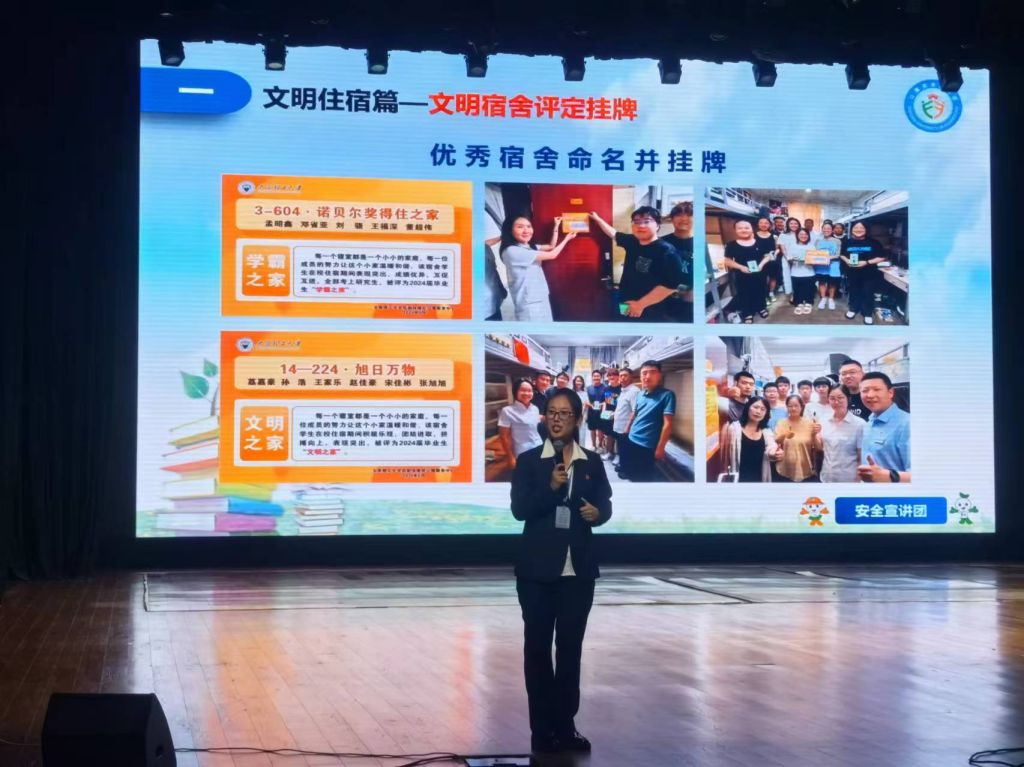 9月27日,在学校明向会堂,学院特别邀请公寓服务中心安全宣讲团的老师走进新生,开展了两场别开生面的公寓安全教育课,新浦金350vip官方党委书记张文基,后勤保障部副部长贾新泽,新浦金350vip官方党委副书记郭飞,后勤保障部公寓服务中心主任于爱菊也出席了本次宣讲活动。公寓宣讲团的老师从宿舍防火、防盗、食品安全、网络安全等多个维度出发,结合真实案例,深入浅出地讲解了公寓安全的重要性及防范措施。现场演示灭火器使用方法更是让新生们直观感受到了安全技能的实际操作,为他们在公寓内营造一个安全、和谐的生活环境提供了有力保障。