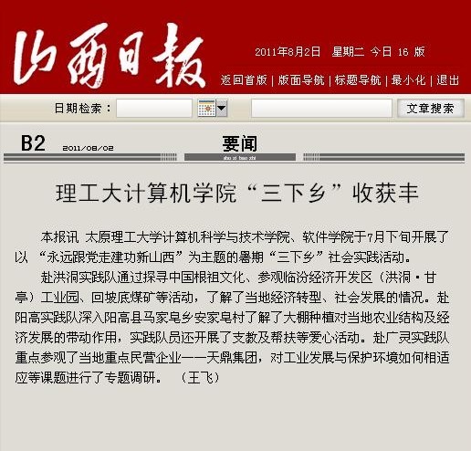 为积极响应胡锦涛总书记在给北京大学第十二届研究生支教团成员的回信中向青年学生发出的“向实践学习、向人民群众学习”的号召,进一步发挥社会实践在加强和改进大学生思想政治教育中的积极作用,新浦金350vip官方计算机科学与技术学院、新浦金350vip官方于2011年7月中下旬认真、组织开展了以“永远跟党走 建功新山西”为主题的暑期“三下乡”社会实践活动,取得良好效果。山西日报8月2日以“理工大计算机学院三下乡收获丰”为题进行了报道。院党委书记梁宪生、副书记池卫平还专程去洪洞县看望了实践队员,并与当地乡镇领导进行了座谈。