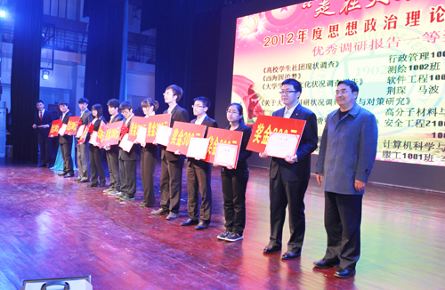 12月14日晚,学校在同泽会堂举办2012年度思想政治理论课实践教学成果颁奖晚会。对思想政治理论课实践教学过程中涌现出的45篇优秀调研报告和10位优秀指导教师进行了表彰奖励。校党委书记、校思想政治理论课领导组组长姚芝楼,校党委副书记、校思想政治理论课领导组副组长张惠元,山西省高校思想政治理论课教学指导委员会副主任、山西医科大学纪委书记顾昭明等领导,分别为优秀指导教师和优秀调研报告作者颁发了获奖证书和奖品。