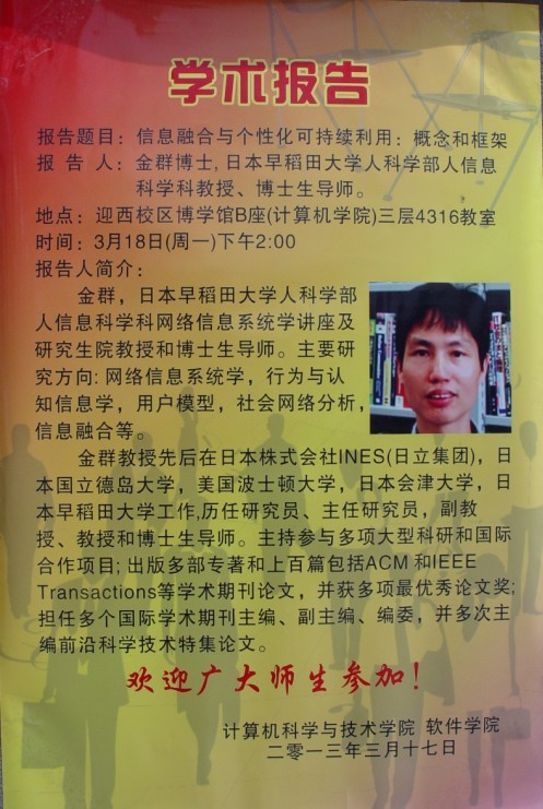 3月18日下午,计算机科学与技术学院、新浦金350vip官方邀请日本早稻田大学教授、我校客座教授金群博士在博学馆B座4316教室做了题为《信息融合与个性化可持续利用:概念和框架》的专题学术讲座。讲座由学院陈俊杰院长主持,学院部分教师、研究生以及本科生代表听取了报告。