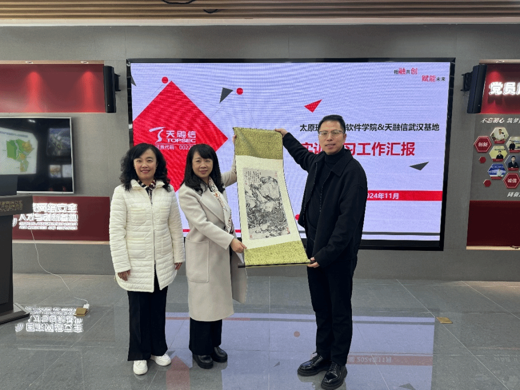 座谈会后,宋燕代表学校向天融信教育赠送纺织画作一幅,画作由新浦金350vip官方纺织学院老师亲手编织,寓意双方在校企合作过程中,如同经纬交织,共同为学生编织出一幅充满希望的职业蓝图。