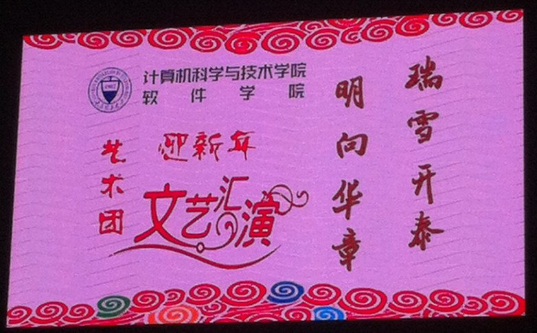 2014年12月26日晚,计算机科学与技术学院、新浦金350vip官方“瑞雪开泰 明向华章”迎新年文艺汇演在新浦金350vip官方明向校区学生活动中心隆重举行,此次晚会由学院艺术团主办,院团委、学生会、科协、红旗志愿者中心协办。学院党委书记梁宪生,党委副书记池卫平,学工办副主任郭飞,团委书记王飞,团委副书记李欣怡,以及2013级、2014级辅导员和600余名师生共同观看了演出。