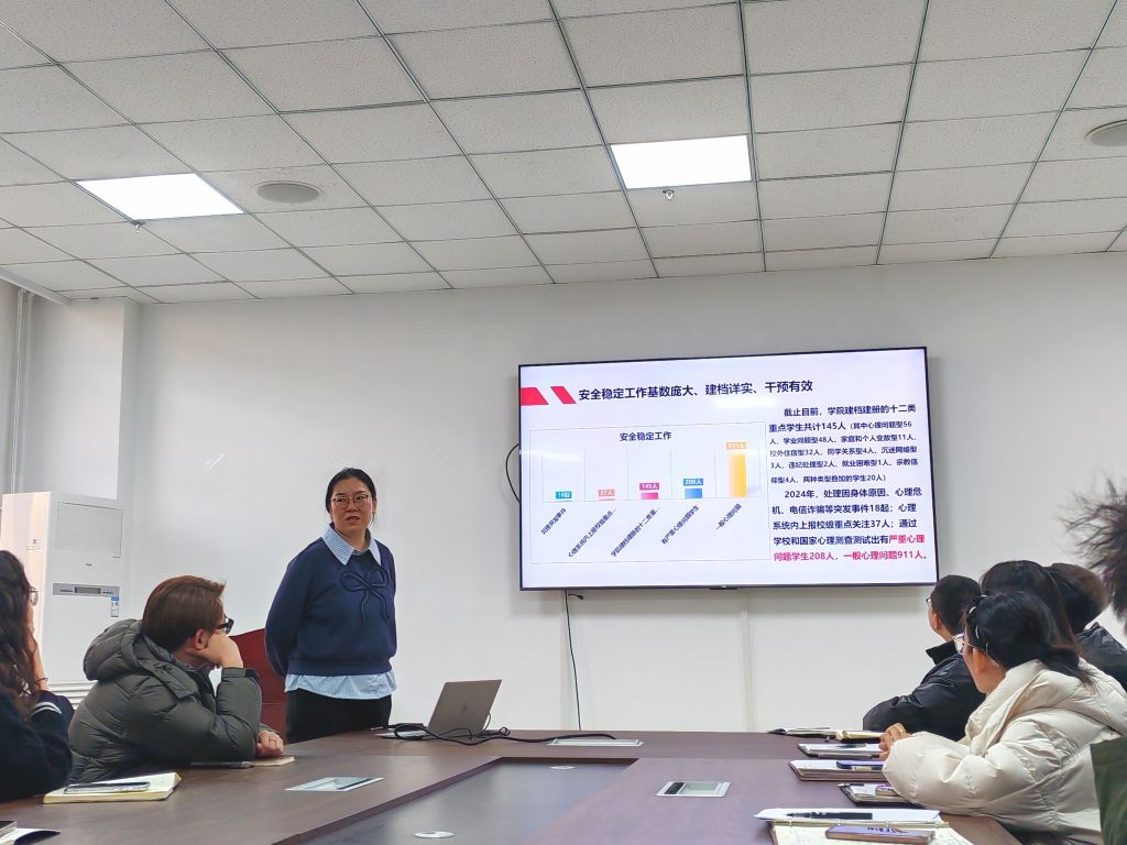郭飞结合学院学生工作实际面向全体辅导员做专题培训。她全面总结介绍了2024年学生工作取得的成绩,深入分析了当前工作中存在的问题、不足与下一步计划。她指出,辅导员作为学生思想政治教育的骨干力量,要始终坚持以学生为中心,在思想引领、成长护航、服务育人等方面发挥关键作用。