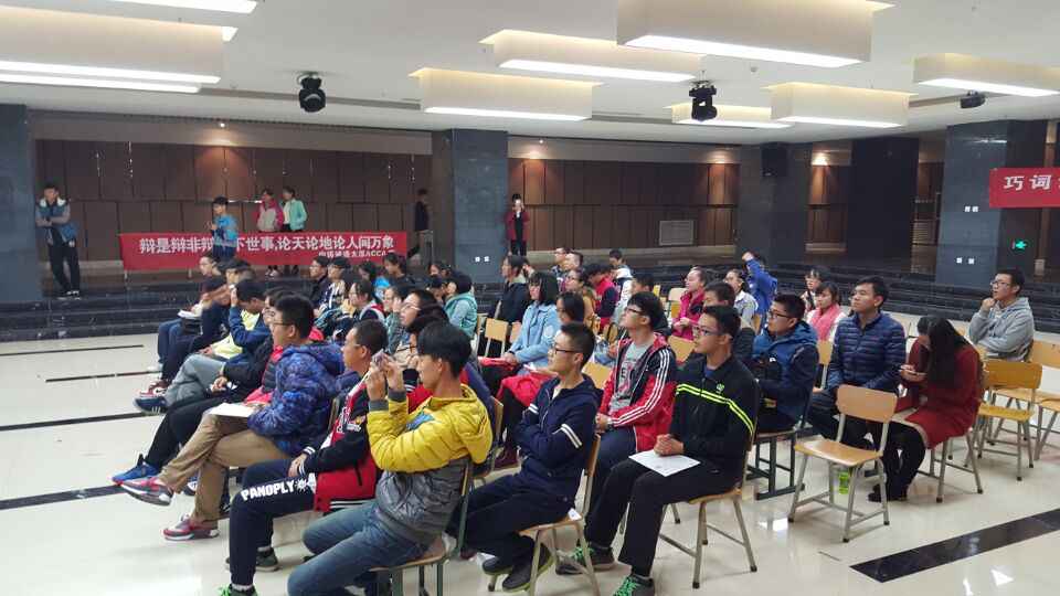 本次大赛的辩题是“徒有智慧更可悲还是徒有勇气更可悲“。双方从高科技罪犯、刘邦项羽、巴黎恐怖袭击等多个例子展开精彩的辩论。队员们灵活多变,激情澎湃,使得整个辩论场面精彩纷呈。而赛后又能引发同学们的思考,给人一份耐人寻味的隽永和深沉。在辩论赛过程中,最精彩的部分是自由辩论,台上双方辩手步步紧逼,唇枪舌剑,展示他们的青春风采;台下座无虚席,时不时地响起掌声。在观众提问阶段,观众们提出了一些值得思考的问题,具有一定的现实性,并指出了辩论场上双方辩手未留意的问题,使辩题的讨论更加深刻。