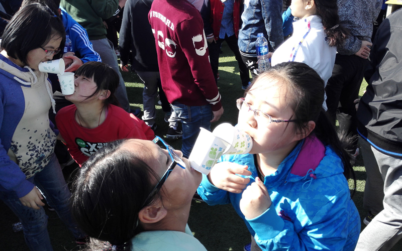 其中,“齐心协力”是最受大家欢迎的游戏,由五人一组,站成一排,相邻两人用绳子绑住脚腕,用尽可能少的时间跑完一段距离。这个活动是一个综合性的活动,既考验了团队协作能力,还挑战了同学们诸如体力、协调能力等身体条件。