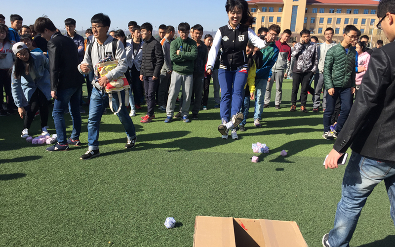 另外,相对其他项目而言袋鼠投球则是本次本次活动中一项很有特色的运动,每小组六名参赛者,每人有一分钟的时间将尽可能多的沙包用脚夹起并投入箱子中。为了增加难度,箱子的入口处特别缩小了直径,激起了同学们的挑战欲,吸引得围观的同学都跃跃欲试。