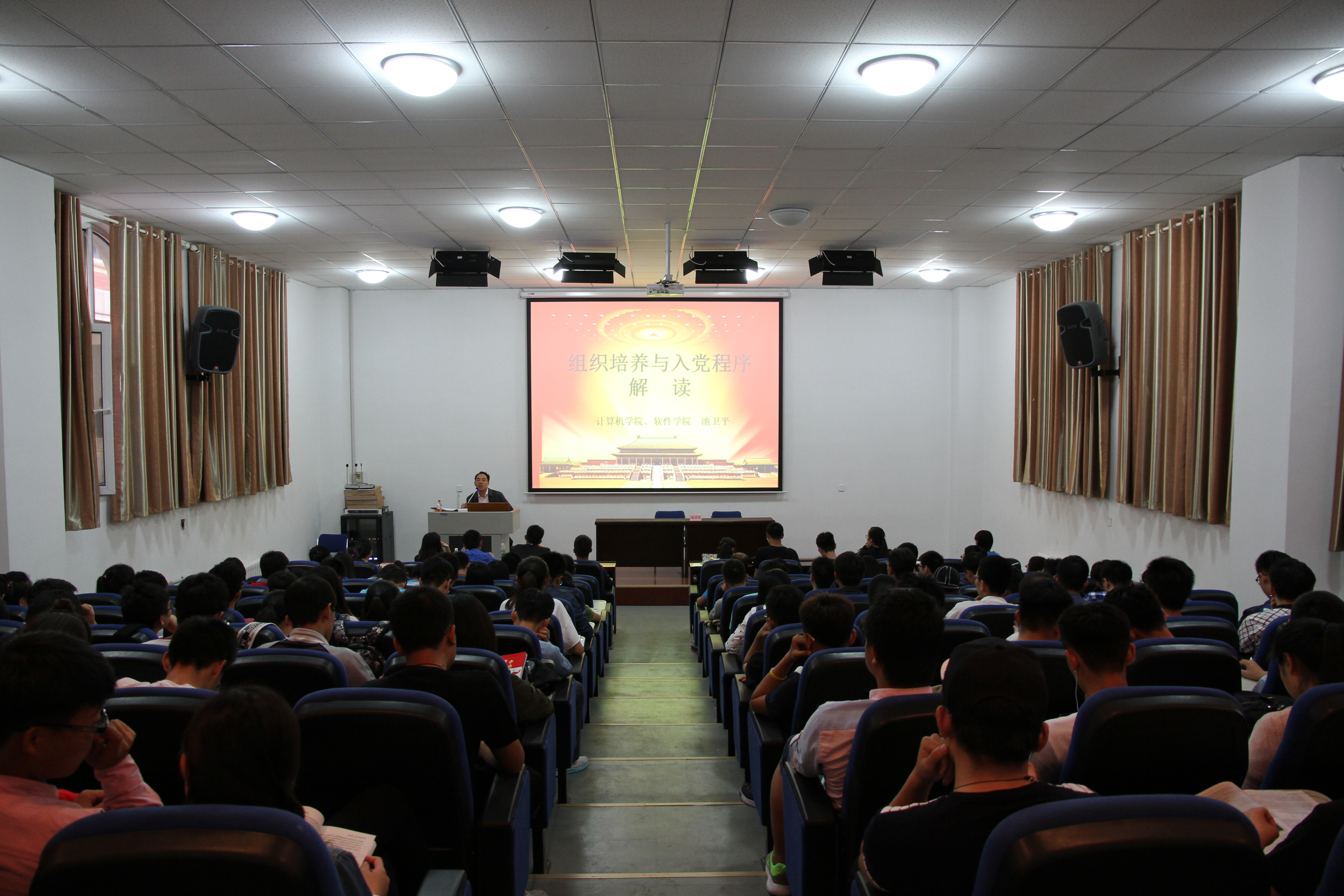 最后一讲,池书记通过精美的PPT演示,就学员们最关注的入党流程问题作了详细讲解。首先要自愿提出入党申请、主动向党组织汇报思想、经过团组织推优、入党积极分子培训考核、列入计划政治审查、发展对象培训考核、填写入党志愿书、召开党支部大会、党委审批、入党宣誓、预备期的培养考察、最后才能成为一名正式的共产党员。在校期间,一套流程下来最少两年。池书记通过自己工作经验、人生阅历,总结了学生常见的五大认识误区:独善其身型、自然等待型、程序默认型、预备结束型、功利至上型。他说道,十八大后对党员的要求更加严格,学员们要看到约束的一面,端正入党动机,以一个党员的标准要求言行。池书记就西方宗教在中国的传播、香港“占中”事件等现实问题与学员们互动,他语重心长地讲道,大学生要坚定立场,不要被不良组织波动思想。之后池书记就《中国共产党发展党员工作细则》中的基本原则和重要表述作了重点讲解。最后池书记推荐了六本精心挑选的书目,希望学员能全方面的了解中国,了解我党。
