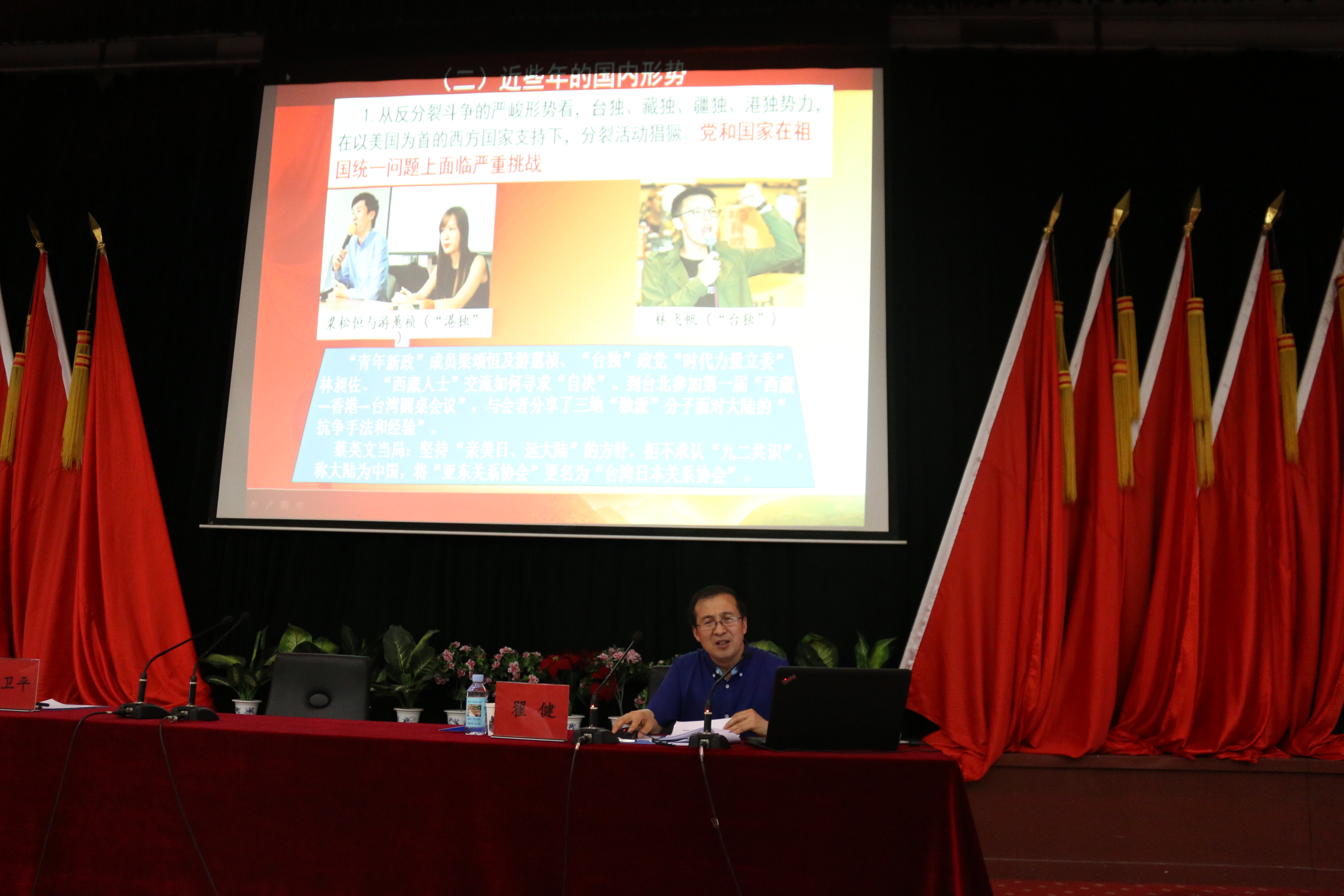 6月16日下午,新浦金350vip官方党委在博学楼二层报告厅开展学习贯彻十八届六中全会精神学习辅导,我校纪委书记翟健应邀做了题为《国际国内党内的严峻挑战形势与全面从严治党》的专题报告。学院领导、各系、部负责人和全体党员及部分入党积极分子共计300余人参加了此次报告会,会议由学院党委副书记池卫平主持。