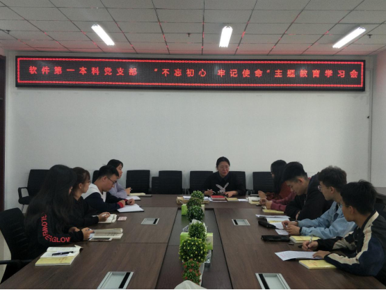 本次会议主要针对三个方面进行展开,一是“不忘初心、牢记使命”主题教育的工作合理规划安排,将教育学习落到实处,并对开展主题教育提出了明确的要求。二是由郭飞老师领学,围绕“不忘初心、牢记使命”展开深入学习,同时学生党员之间交流自主学习后的心得体会。三是对今后党支部基础建设提出新的要求,郭飞老师强调,我们要在加强学习,提高自主能动性,发挥党员先锋模范作用的同时,开展支部特色活动,并将原有的特色支部活动不断拔高。