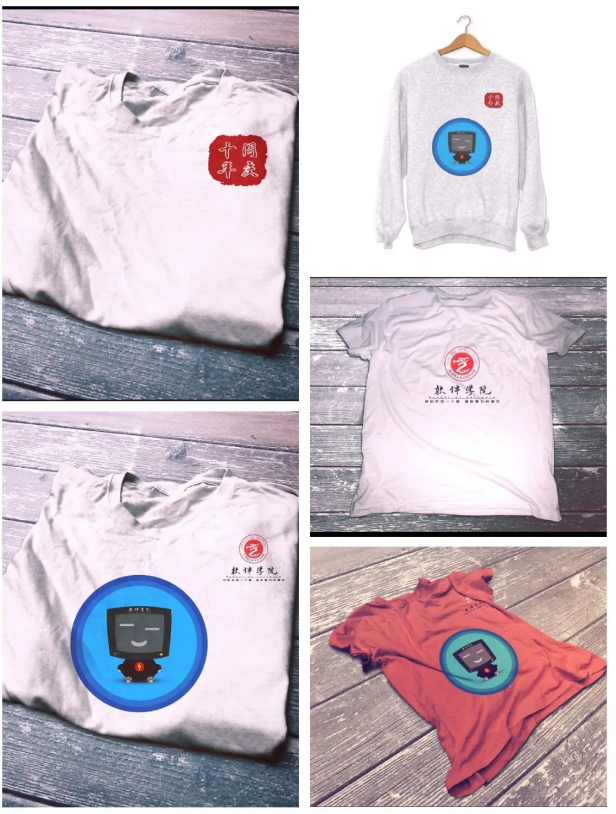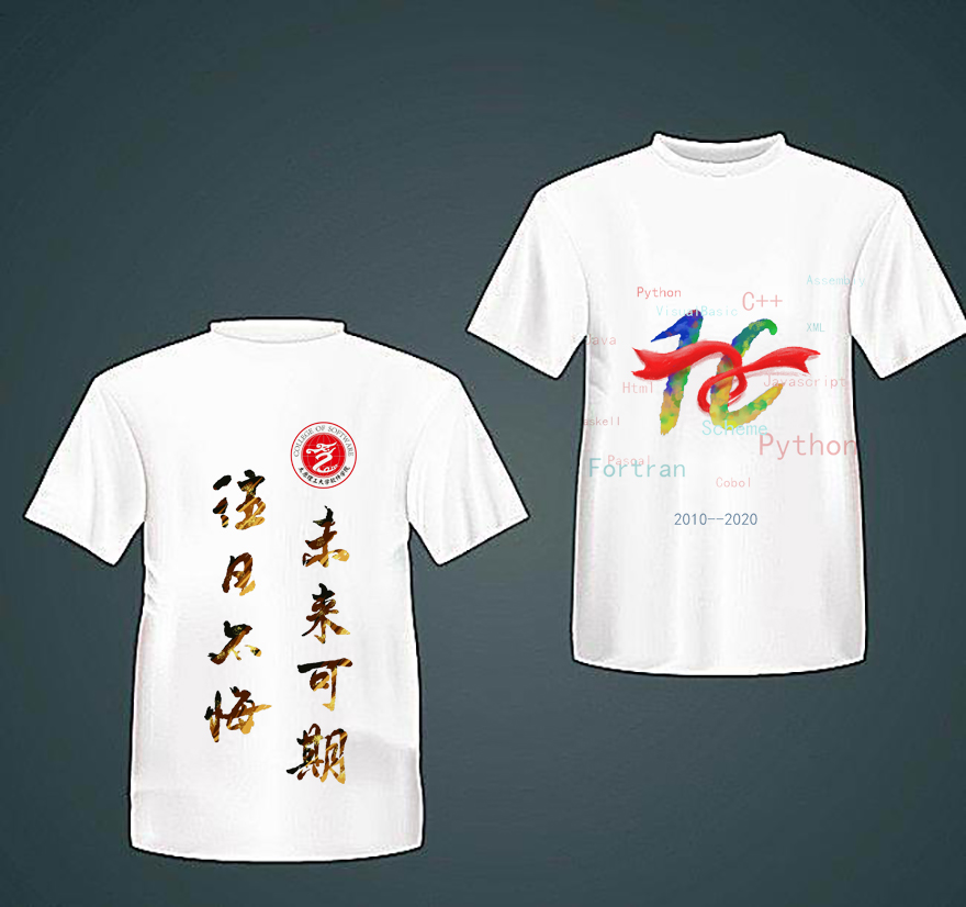该T恤的正面以“C++”“Java”等软件专业课程为背景,代表软件工程这一专业;以数字10为核心,代表新浦金350vip官方10周岁的院龄,以彩色着色,象征软件青年个性万千,迥然有异,但是都积极向上,蓬勃进取。飞扬的红飘带拴在数字10上,代指全体软件人团结一心,互帮互助;同时,红飘带还蕴含很多美好的品质,比如勇敢,善良,坚强,友爱等。红飘带系着幸福,新时代的我们都是幸福的。