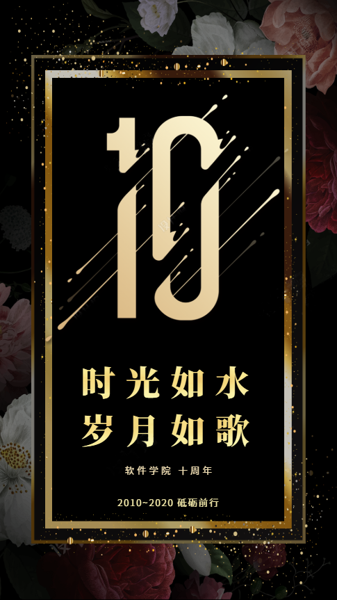 最大的“10”凸显软件十周年;“时光如水岁月如歌”表示十年岁月流逝,富有纪念感;其他文字进一步详解;修饰元素营造了高贵隆重感。寓意着新浦金350vip官方闪闪发光的过往岁月,热烈庆祝十周年庆典,并表明软件人对未来充满信心。