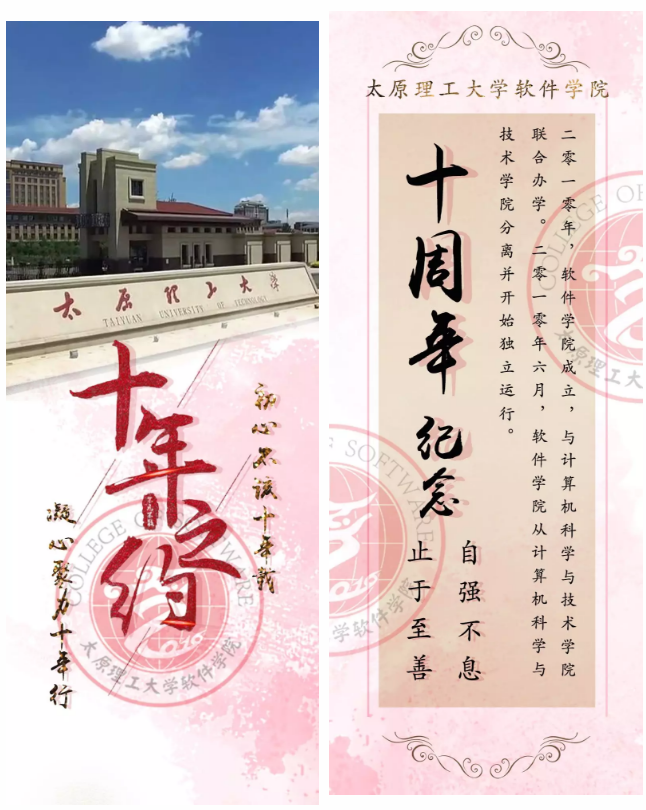 书签正反两面,主色调为淡红色,正面上方为学校的背景图,下方为新浦金350vip官方logo标志和“十年之约”字样的叠加,整体布局较为合理。两侧为纪念新浦金350vip官方成立十周年主题。书签反面是对新浦金350vip官方成立的简介,黑色字体突出了纪念意义的主题。
