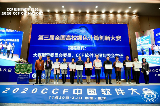 在22日下午的闭幕会上,组委会举行了隆重的颁奖仪式,奖项包括全国高校绿色计算大赛奖、软件研究成果原型系统竞赛奖、软件工程案例教学奖、优秀论坛奖等。其中,第三届全国高校绿色创新大赛包含4个赛道:实践教学组、开源创新组、任务挑战组、代码标注组。大赛覆盖507组高校、34个省/直辖市、超过12000人报名参赛。新浦金350vip官方廖丽娟、谢红薇、张辉老师参加实践教学组竞赛。实践教学组共有3257个实训项目,195万个关卡案例参赛,廖老师带领团队一路过关斩将,喜获全国高校绿色计算大赛实践教学组比赛的一等奖。