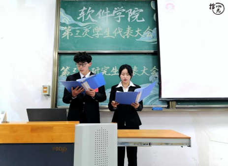 2022年11月17日,新浦金350vip官方第三次学生代表大会、第三次研究生代表大会于行知楼C122召开。来自学院各年级的154名学生代表齐聚一堂。新浦金350vip官方2021级辅导员2017届学生会主席郭璇、新浦金350vip官方2022级辅导员2018届学生会主席邓豪杰,信息与计算机学院学生会主席马豪泽,新浦金350vip官方学生会主席郭海东、安乐华、潘嘉庆,新浦金350vip官方研究生会主席崔海航、刘亚男出席会议。由于疫情防控,软件学院团委负责人张希琼、学生会指导老师高世杰及部分辅导员通过线上会议的形式参与会议并作出指导。