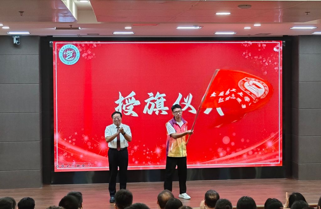 迎新志愿者代表上台发言,号召全体志愿者以实际行动将志愿精神内化于心,为迎新工作贡献自己的力量。张文基为迎新志愿者队伍授旗,志愿者代表接过了象征责任与荣誉的旗帜,郑重宣誓,在他们铿锵有力的誓言下,迎新工作正式拉开序幕。