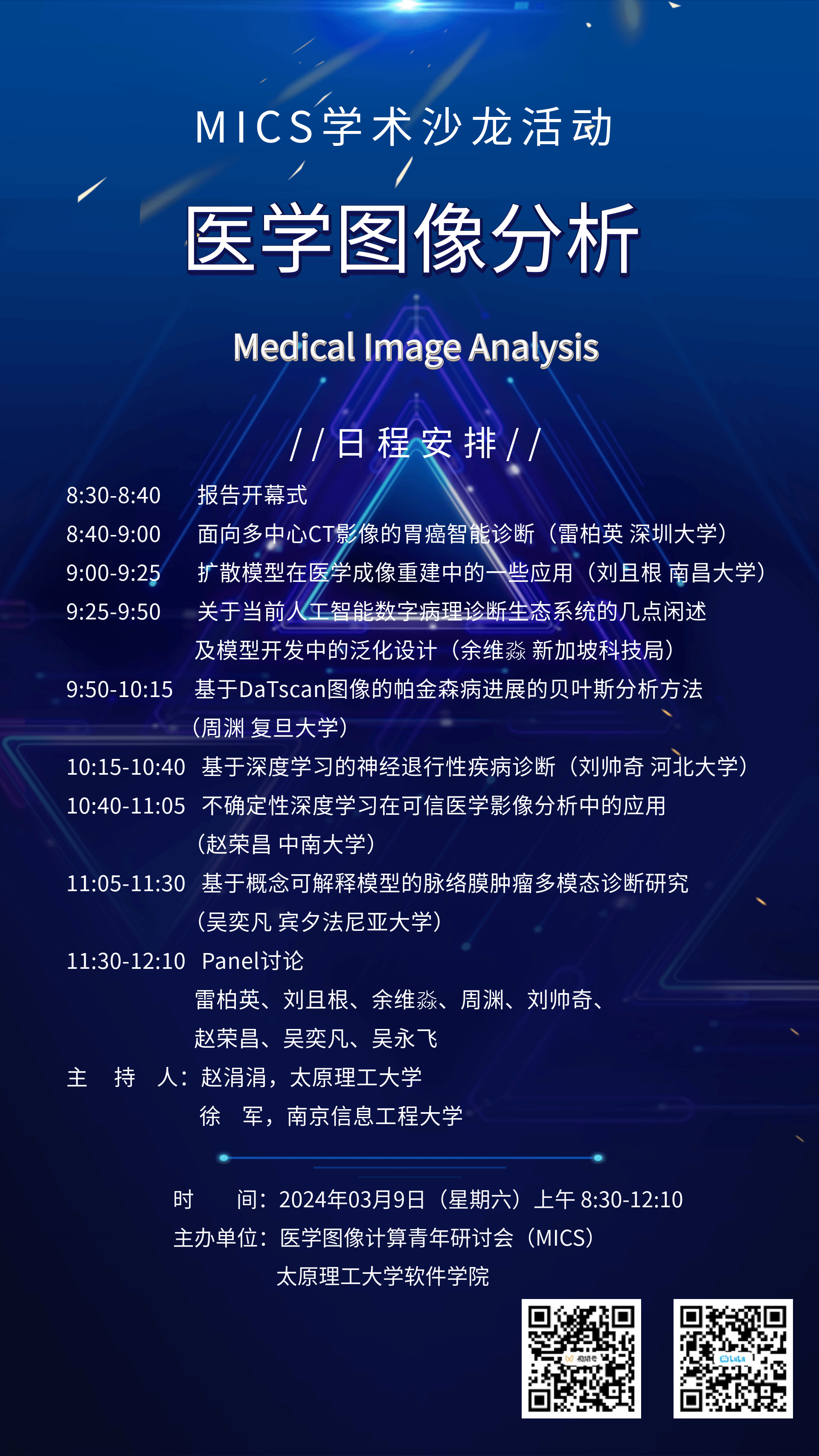 随后,报告嘉宾分别就近期在“医学图像分析”方面做的工作,进行了精彩的汇报。雷柏英教授主要介绍了面向多中心CT影像的胃癌智能诊断,其中包括胃癌术前淋巴结转移预测、原发肿瘤分割、术前肿瘤分割以及淋巴结转移预测等内容。刘且跟教授就扩散模型在医学成像中的应用介绍了团队的工作和经验。余维淼教授分享了自己关于当前人工智能数字病理诊断生态系统、模型落地以及模型开发中的泛化设计方面的一些思考,并给予年轻同学与青年学者们一些宝贵的赠言和鼓励。周渊老师就基于DaTscan图像的帕金森病进展的贝叶斯方法进行了分享。刘帅奇教授介绍了课题组在基于深度学习的神经退行性疾病,包括多动症和自闭症诊断方面的一些工作。赵荣昌教授分享了课题组关系不确定性深度学习在可信医学影像分析中做的一些工作。吴奕凡博士分享了基于概念可解释模型在罕见疾病辅助诊断方面的应用。