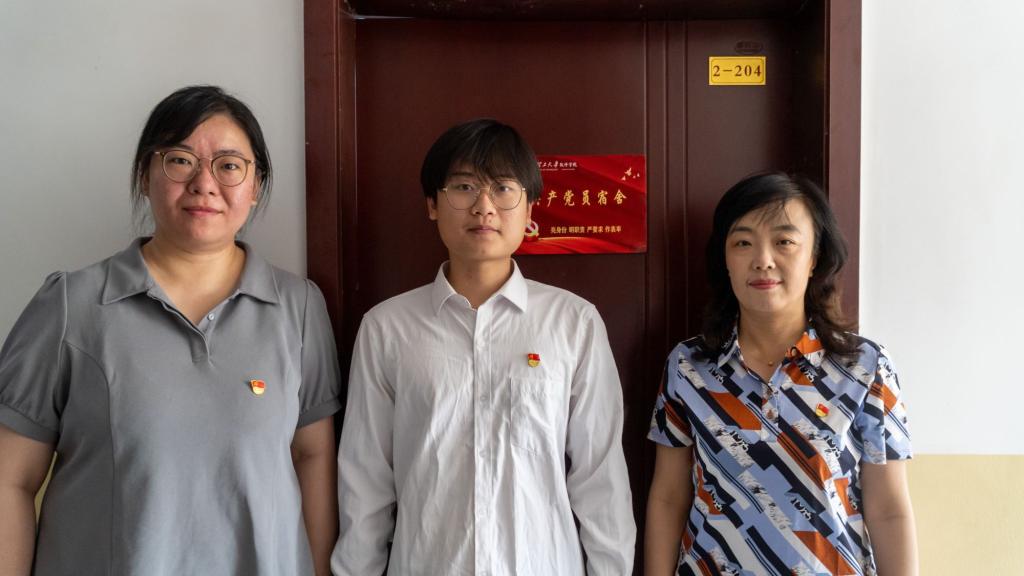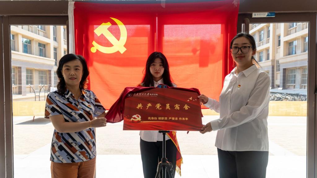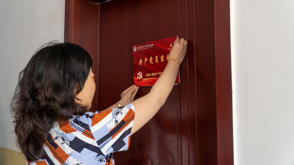 最后,赵涓涓、郭飞、王泽与教师党员代表一起前往党员宿舍。赵涓涓亲自为学生党员宿舍挂上“党员宿舍”牌匾,强调学生党员要将自己所在的寝室建设成内务整洁、学风优良、服务奉献、安全文明的模范型宿舍,充分发挥模范带头作用,并引领学生宿舍积极向党员宿舍看齐。