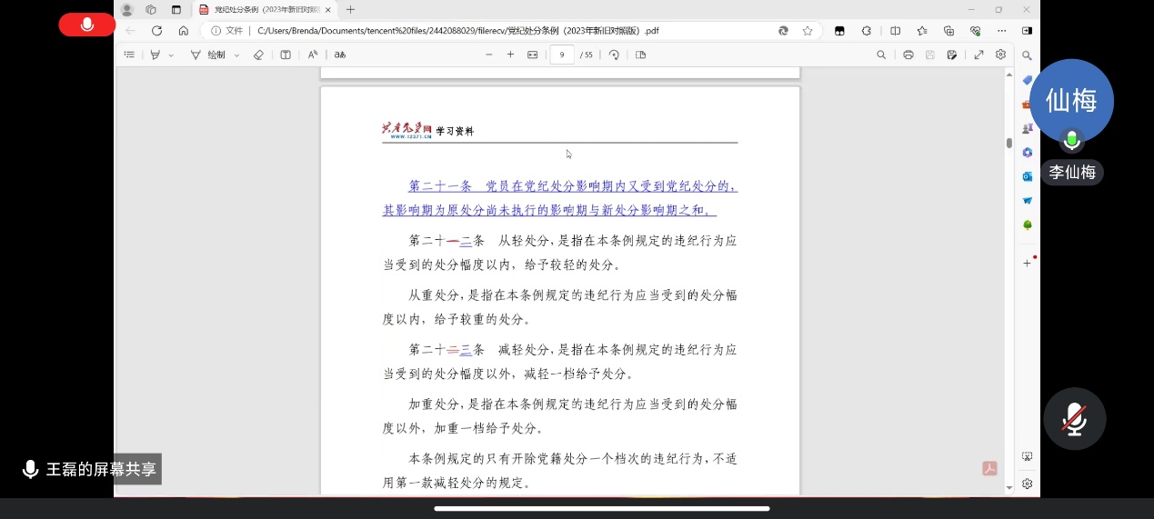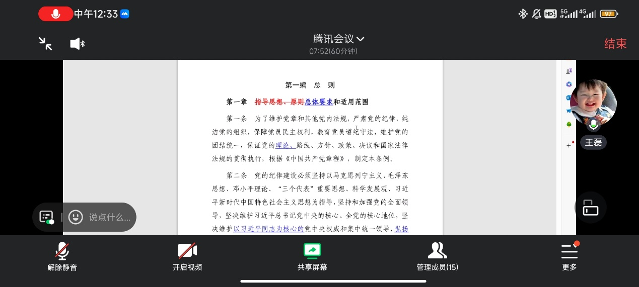 为提高党员党性修养,强化纪律意识,软件第八本科党支部于2024年5月20日中午通过腾讯会议,以专题研讨会和个人自学相结合的形式,组织支部党员认真学习贯彻新修订的《中国共产党纪律处分条例》(以下简称《条例》),推动党纪学习教育走深走实、入脑入心。会议由支部书记李仙梅主持,全体党员参加。