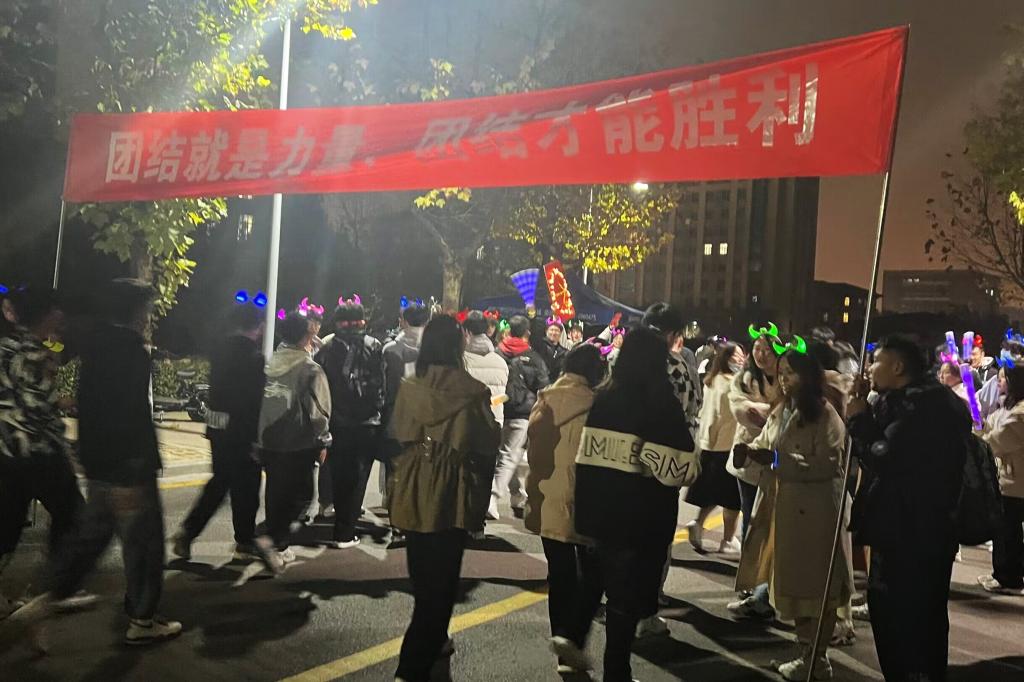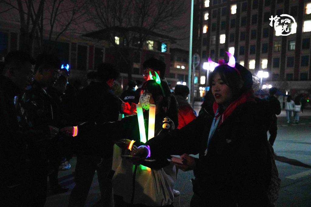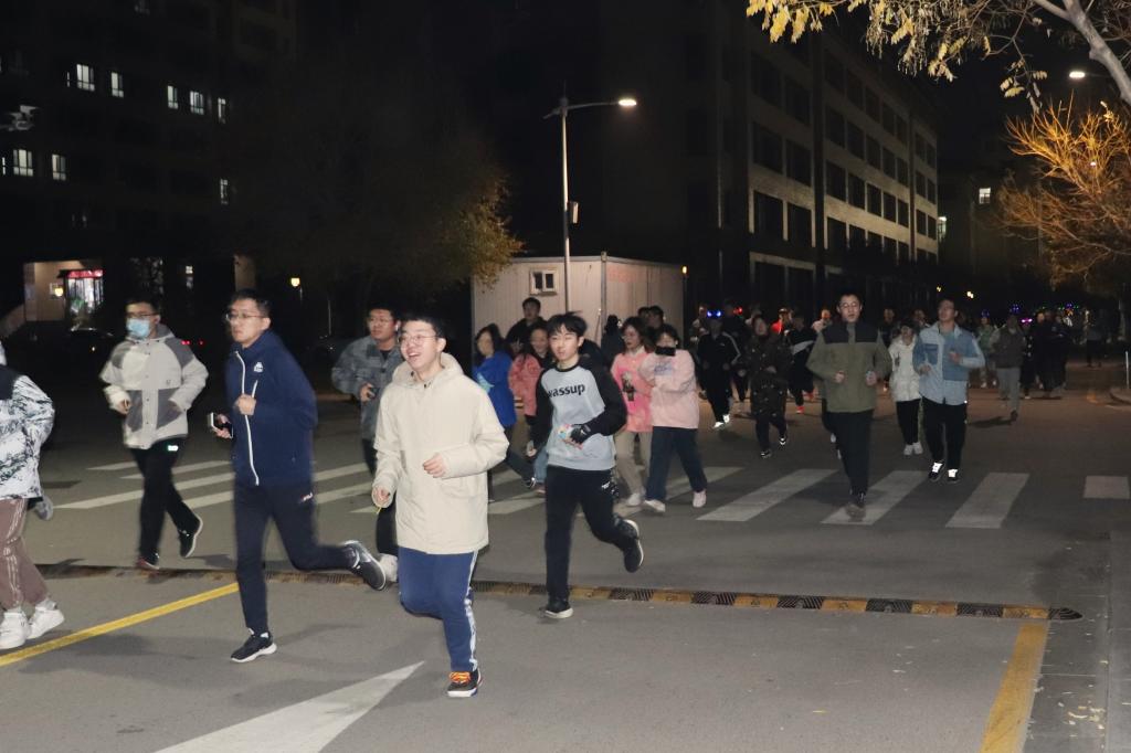 活动的第二阶段为夜跑环节。跑步路线设立五个打卡点,同学们佩戴荧光手环,在各打卡点集齐五张卡片,拼接成完整的党的二十大知识拼图,即完成活动全程。在荧光的点缀下,涌动的人群串联成星光海洋,形成一道道亮丽的风景线。