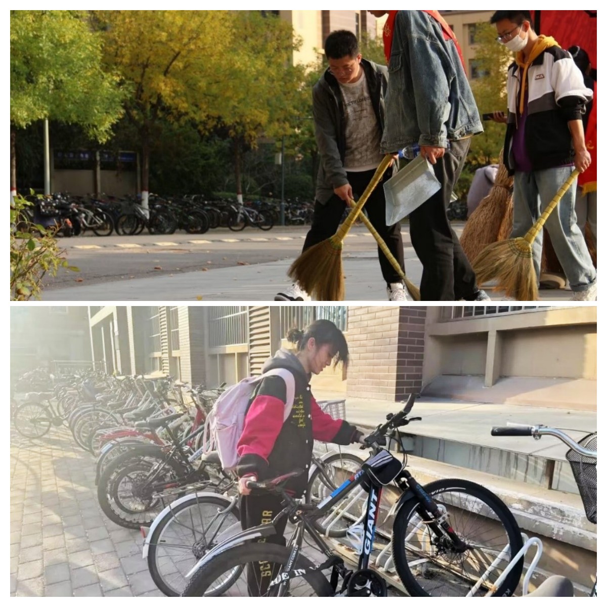 为美化校园环境,红旗志愿者中心组织志愿者们进行了清扫校园垃圾、整理自行车等志愿服务。大家手拿扫帚、簸箕、垃圾桶等劳动工具,分工协作,密切配合,不放过每一个角落。面对肆意停放、倒地的自行车,志愿者将它们整齐地摆放到规定地点,腾出了人行道,方便来往的行人通过。过程中,很多路过的同学也主动加入进来,这份内心的温暖拉近了彼此的距离。一个个细微的举动,诠释出雷锋精神在新时代最好的模样。