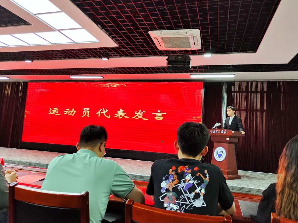 表彰大会在总结视频中拉开序幕,一幕幕画面瞬间将大家带回心潮澎湃的比赛现场,再次激荡起内心的涌动。郭飞在致辞中肯定了新浦金官网在此次运动会中取得的骄人成绩,并指出体育强则青年强,青年强则国强,新浦金官网将不断加强体育文化建设,贯彻落实五育并举发展的教育理念;教师代表张希琼勉励学生要把运动会上的这股拼搏精神延续到日后的生活中,以饱满的热情、昂扬的斗志,为美好的未来不断奋斗;王庐茸代表全体运动员感谢学院的支持,决心要将昂扬向上的体育精神发扬光大。