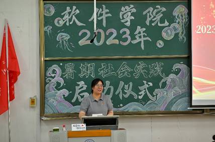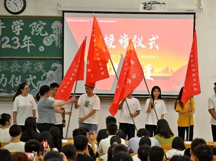 郭飞进行授旗仪式,将队旗都郑重地交到了每一位实践队长手中,并给予了殷切的期望,并转达了李栩书记对实践队伍的希望与要求:“大家要时刻谨记安全第一,将此次实践活动当作第二课堂,虚心学习,共同成长,各位同学要不怕吃苦,展现出我们大学生应有的风貌!”随后,郭书记分享了自己从大学到工作后的实践经历,表达了对此次实践活动的高度期望。她希望大家可以用脚步丈量我们脚下的这片土地,克服困难,把握住易逝的青春岁月!同时,郭书记宣布新浦金350vip官方2023年暑期“三下乡”社会实践活动正式启动!