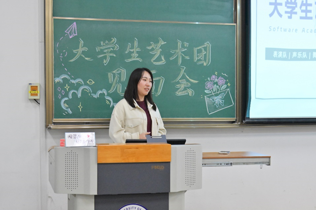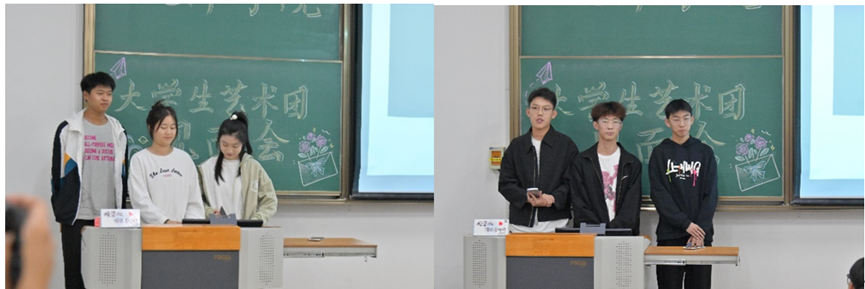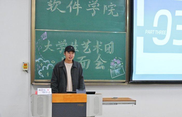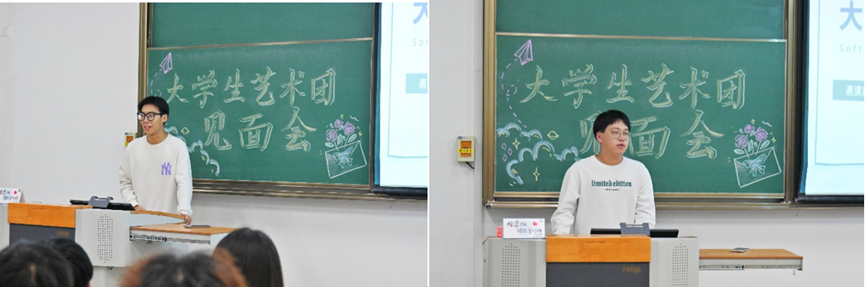 随后,李昱达讲述了他在艺术团的种种收获,希望大家坚持自己的初心,在自己的工作岗位上发光发热。郭展东则通过自己在大学生艺术团的成长历程勉励新一届艺术团成员,鼓励大家积极进取,开拓未来之路。