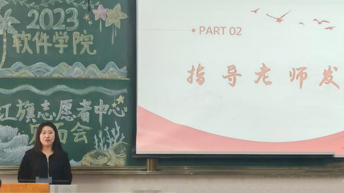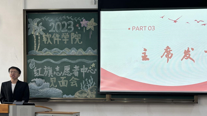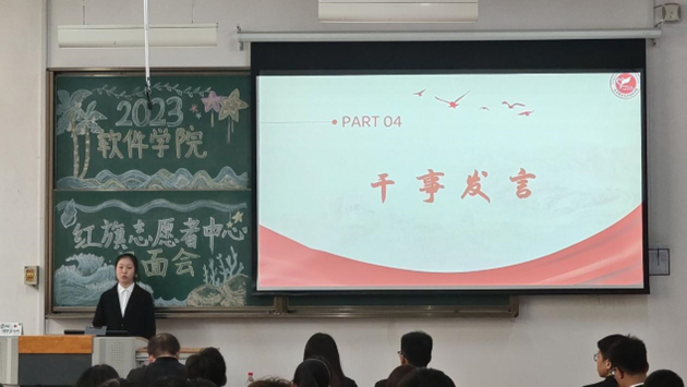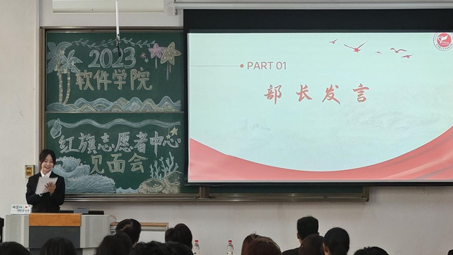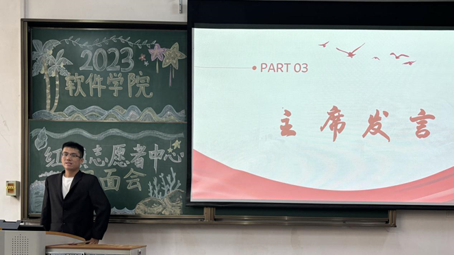 两位红旗志愿者中心主席也发表了精彩的致辞。张浩主席首先表达了对新生干事们的热烈欢迎,并对各位新生干事寄予厚望,嘱托新生干事们传承红旗志愿者精神,希望其在红旗大家庭中能够实现蜕变。逯明昊主席以红旗的“传承”精神开篇,并借“不积跬步无以至千里,不积小流无以成江海”激励各位新生干事学会奉献,理解每一次付出都是有意义的,每一个奉献都会让自己得以成长。