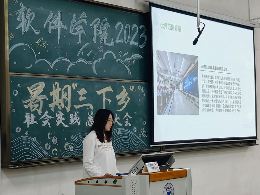 张希琼老师对大会进行了总结。她对此次实践活动的成果予以肯定,并且分享了自己历次的"三下乡"社会实践经历,希望同学们怀抱梦想又脚踏实地,敢想敢为又善作善成,投身社会,将自身所学化作实际行动,贡献青春力量,立志做有理想、敢担当、能吃苦、肯奋斗的新时代好青年。