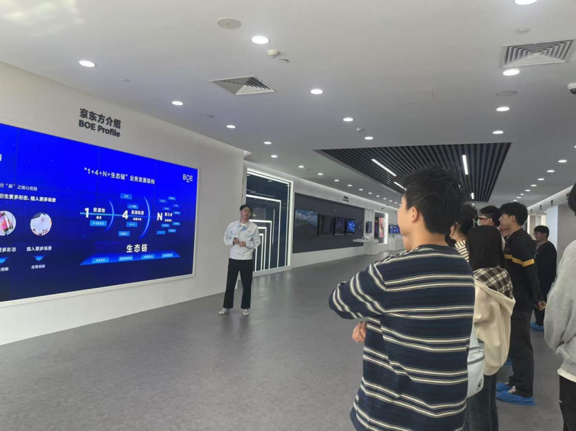 首先在公司专业技术人员的带领下,学生们首先参观了公司展厅。技术人员详细介绍了液晶显示(LCD)、有机发光二极管(OLED)等核心技术的工作原理,以及智能手机、电视、电脑等半导体展示,互联网技术如何应用于工业互联网,智慧医工,智慧园区,智慧家居,智慧零售,智慧教育智慧办公,等多种终端设备。