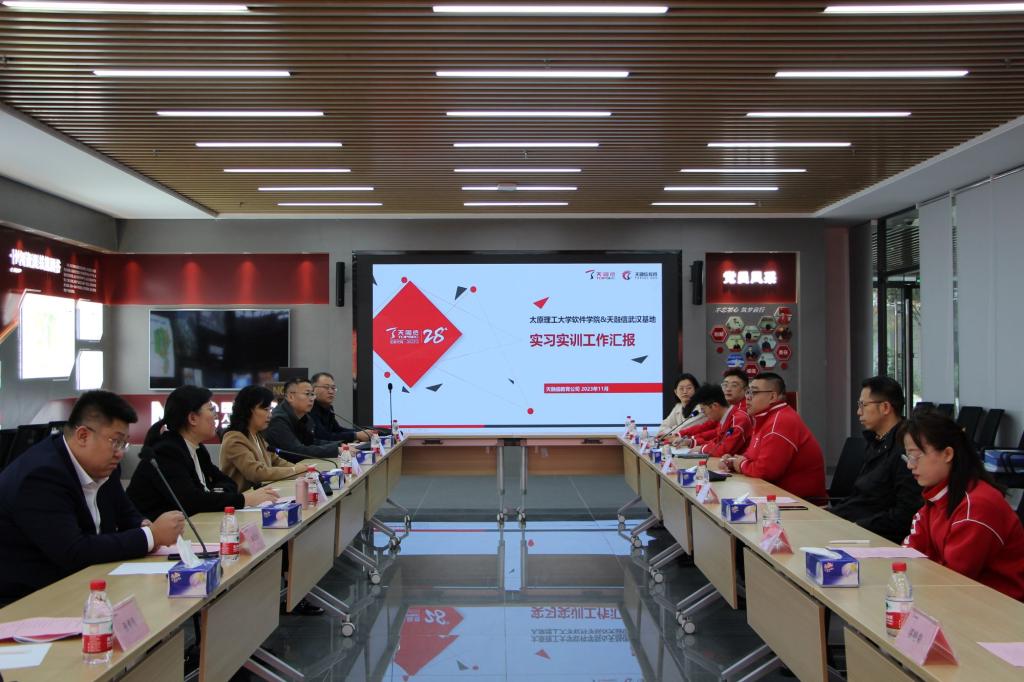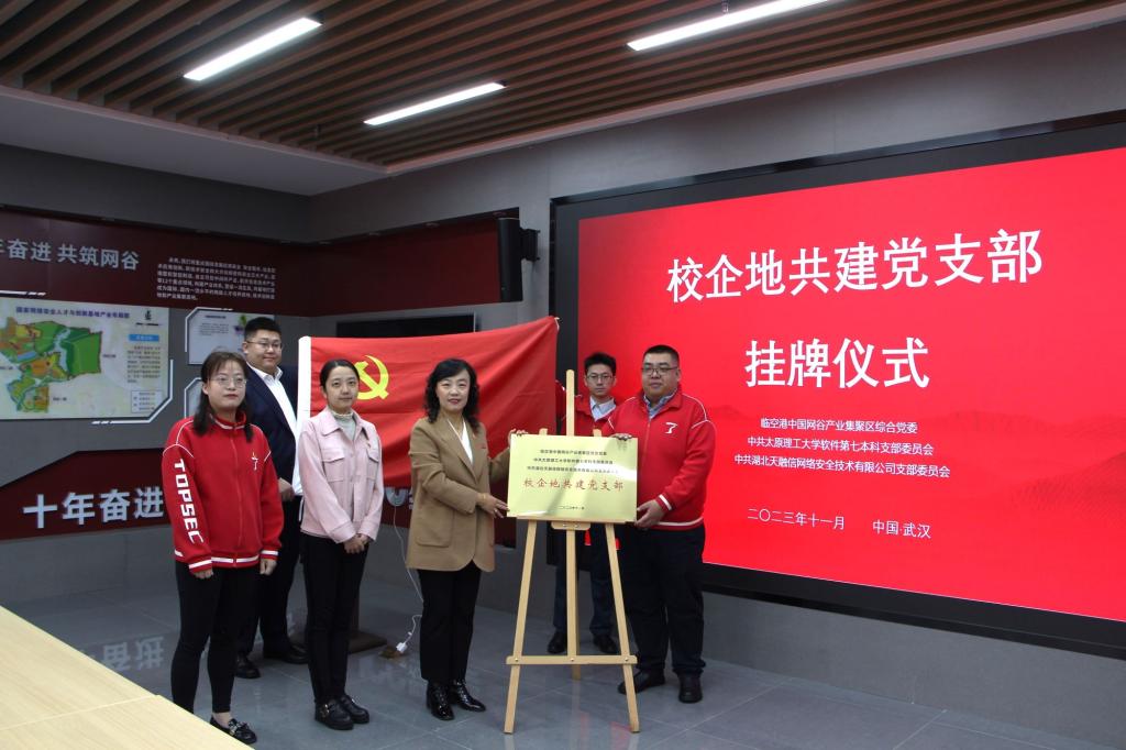 在武汉天融信实训基地,学院领导和老师们重点检查了基地的教学质量、师资力量、学生管理、学生就业等方面。同时,了解了实训基地在推进校企合作、产教融合等方面的做法和成果。在与实训基地负责人和学生代表的座谈中,学院领导强调了校企合作的重要性,希望双方进一步加强沟通合作,共同推动人才培养质量的提升。在实训基地期间,学院第七本科党支部与临空港中国网谷产业集聚区党支部、湖北天融信网络安全技术有限公司党支部举行了校企地共建党支部挂牌仪式。