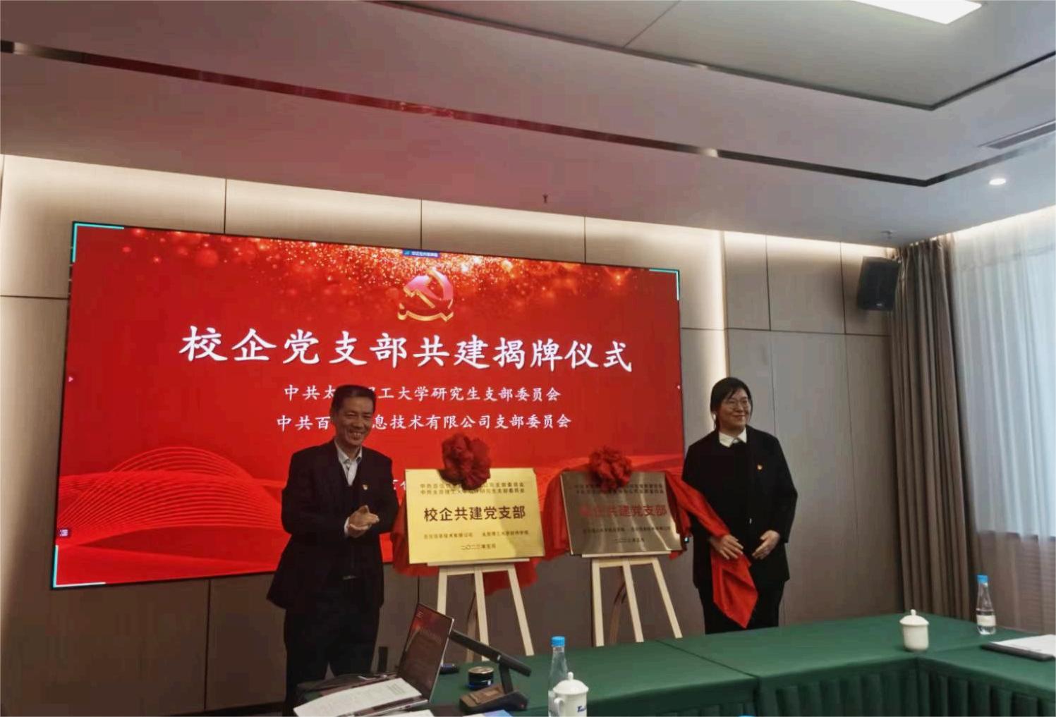 新浦金350vip官方研究生党支部与百信党支部举行了校企共建党支部挂牌仪式,通过党建共建的合作,建立起常态化沟通协商机制、工作通报机制和业务互促机制,实现党建品牌创建与产教融合工作的有机融合,以高质量党建推动学校、企业的高质量发展。