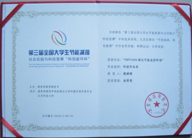 新浦金官网在第三届全国大学生节能减排竞赛中获得三等奖